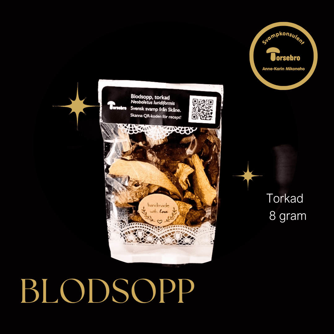 Blodsopp, smör och grädde går bra ihop men undvik rödvin. Blötlägg först den torkade svampen ca 3o min och spara spadet. Stek den urkramade svampen i smör, tillsätt grädde och spadet samt ev lite buljong/fond. Tillaga gräddsåsen länge på låg värme och smaka av med salt och peppar. Testa också laga vegetarisk pytt med blodsopp och halloumi till stekt ägg. Istället för inlagda rödbetor kan du ha plommonchutney till.